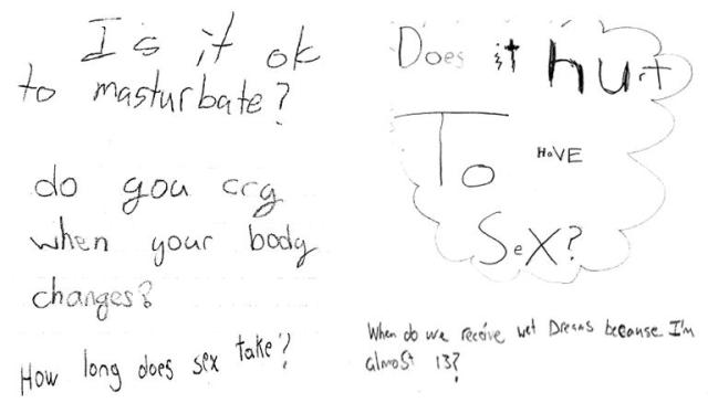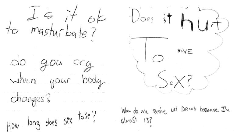 Children need to know the facts. They have questions, and if they aren’t getting the information from their parents, then I bet it is coming from other sources like their friends or the media. The problem with this is that they can get false information or confusing messages. Don’t believe me? Here is an anonymous question from a grade 7 student: