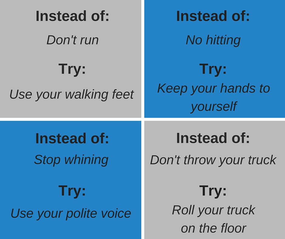 No parent wants to constantly be nagging their kids, but with a little rephrasing, it is possible to cut down on how often you use “Don’t, No or Stop”. Take the challenge! Give it a try! Let us know how it goes!