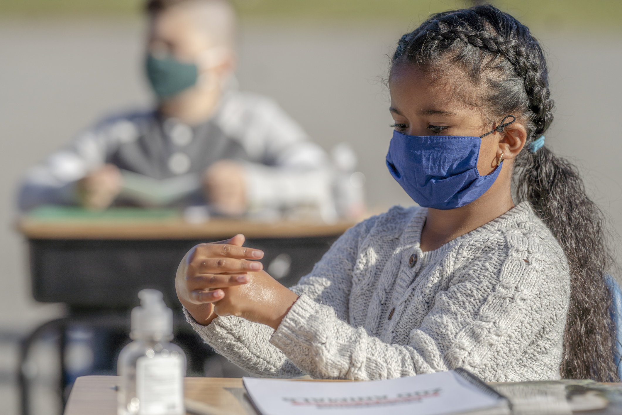 Eight year old female student sitting at classroom desk wearing a mask and applying hand sanitizer.